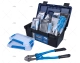Gereedschapset koffer: Blauwe gereedschapskist 40 x 21 x 18,5 cm, blauwe objectdoos 15c 23 x 12 x 3,7 cm, LED werklamp, platte tang 6"/150 mm, naaldpunt tang 6"/150mm, knipschaar 14"/350 mm 4 mm/c, stilson moersleutel 10"/250 mm, verstelbare moersleutel 10"/250 mm, inbussleutels set 9, platte sleutel 6, platte sleutel 7, platte sleutel 8, platte sleutel 9, platte sleutel 10, platte sleutel 11, platte sleutel 12, platte sleutel 13, platte sleutel 14, platte sleutel 17, platte sleutel 19, platte sleutel 22, kruiskopschroevendraaier 30 x 75 mm, kruiskopschroevendraaier 60 x 100, platte schroevendraaier 60 x 100, nageltang 10"/265 mm(2,4/3,2/4/4), meetlint 30tx19mm, plat/kogelkraanhamer 450gr, handvijl set 3 mini 5 x 180 x 6 mm, veiligheidsmes, snijmessen 0,6 10 mesjes.